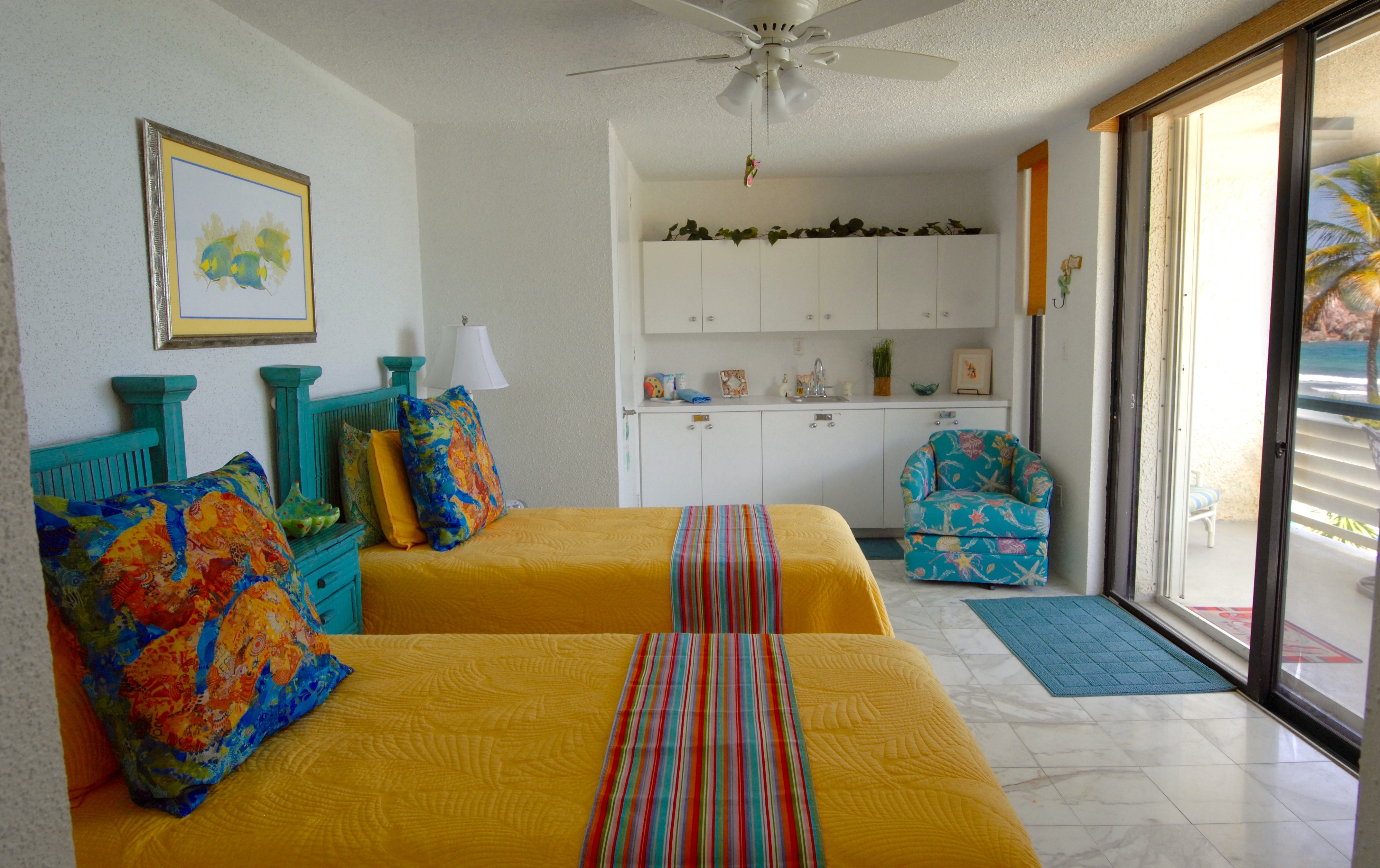 SPACIOUS CARIBBEAN LIVING!!! Master bedroom suite is the equivalent size of a Studio condo with King bed, dresser, futon/sofa, bistro table,en-suite full bathroom with tub and shower, A/C, ceiling fan, digital cable TV, walk-in closet & sliding door to 45' oceanfront furnished balcony,overlooking the tranquil pool
